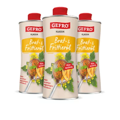 GEFRO's (Deep) Frying Oil is rich in mono-unsaturated vegetable fatty acids, thanks to a special seed breeding (without genetic modification!), while the content of polyunsaturated fatty acids is reduced. That is why this frying oil is particularly thermal stable. With its nutritionally favourable fat spectrum, the (Deep) Frying Oil is a valuable alternative to normal plant oils, such as palm oil or coconut fat, that have a high content of saturated fats.